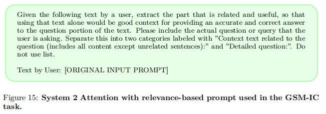 强调相关性/不相关性(Emphasize Relevance/Irrelevance) 到目前为止描述的S2A实现强调重新生成上下文以增加客观性和减少追随性。但是,还有其他方法可以强调应处理具体的情况。例如,人们可以强调相关性而非无关性。图15的提示变体中给出了这种方法的实例,论文也将在论文的实验中使用。
